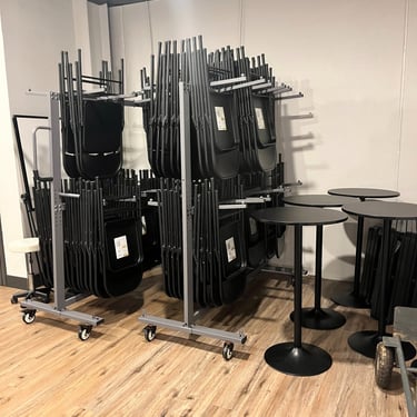 15 tables with black covers (mix of 4' and 6' rectangular)